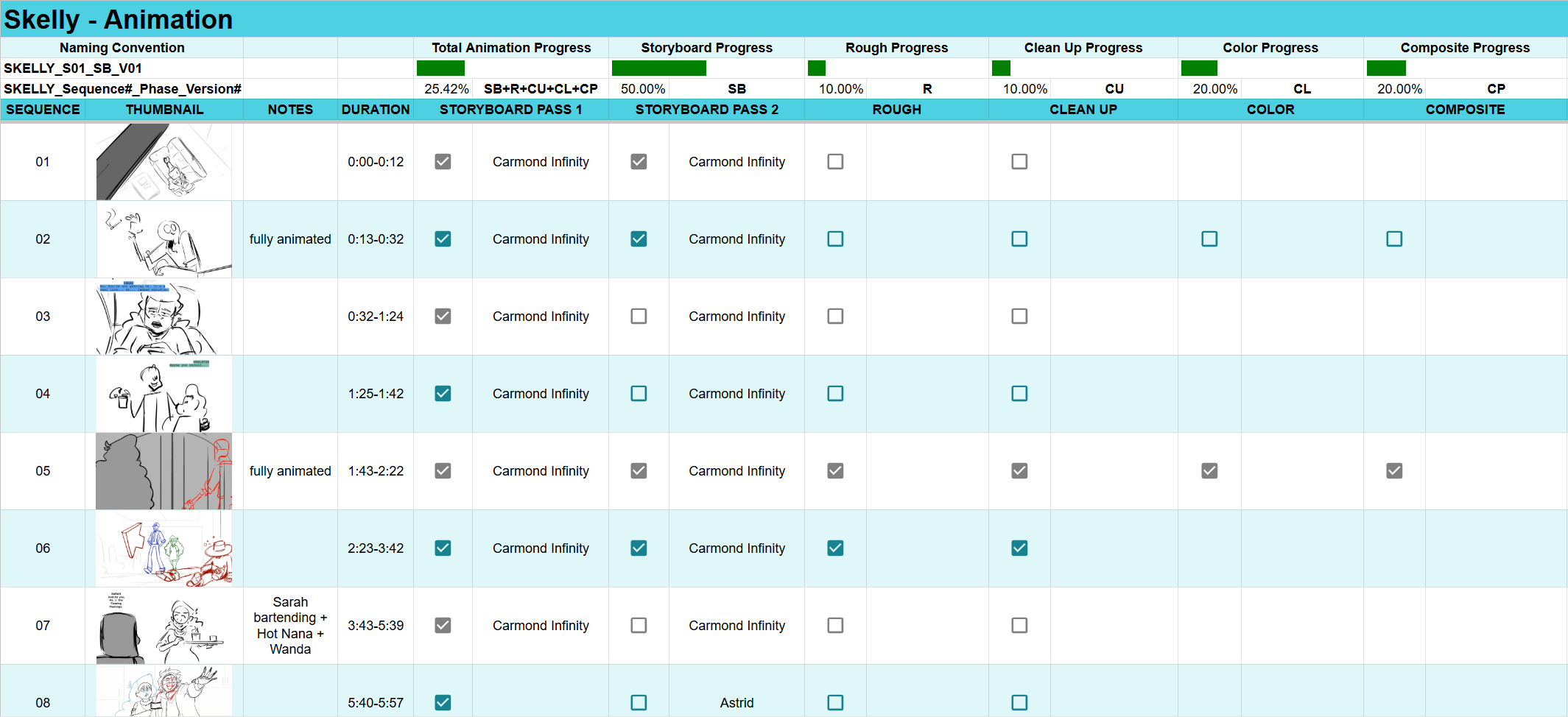 This pilot was organized by sequence rather than by shot. Work was assigned with time stamps instead of shot numbers, making the DURATION section very useful to the animators of this project.